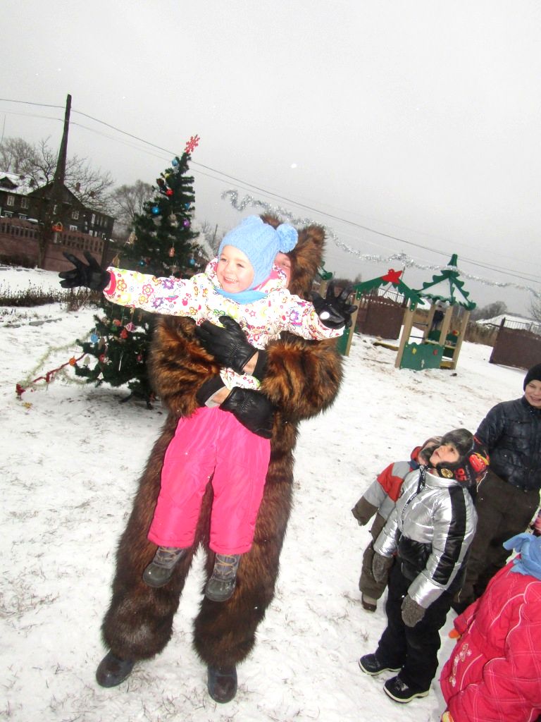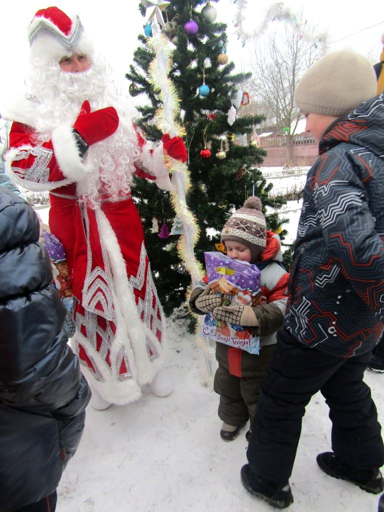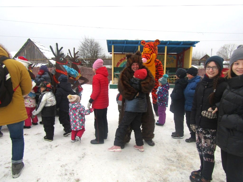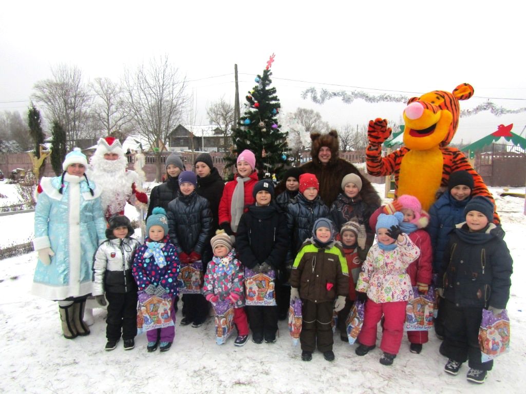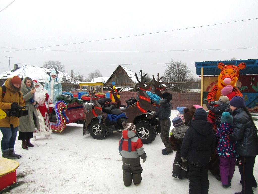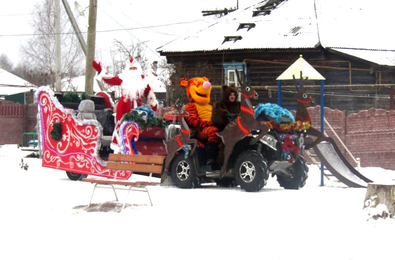 Дед Мороз и Снегурочка явились к детям  на сверкающих чудо-санях в «оленьей упряжке», да еще в сопровождении огромного Медведя и такого же большого Тигра. Сказочный экипаж доставил детворе эмоции  восторга и радости, и конечно же, игрушки и сладости.