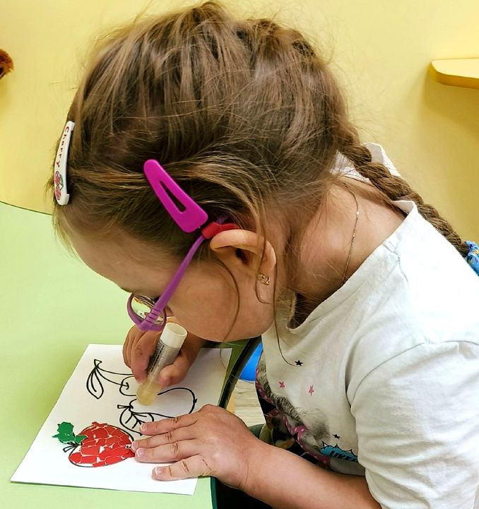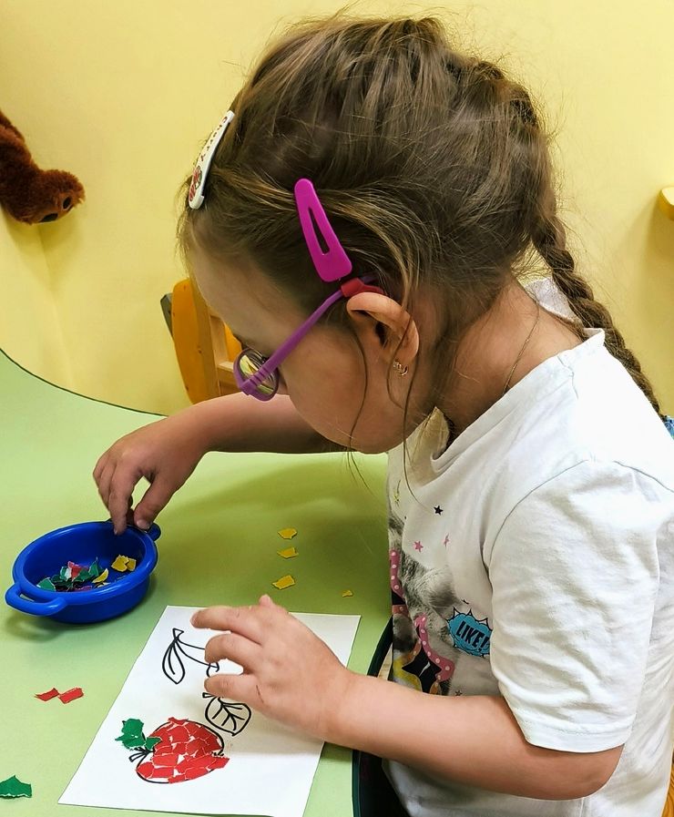 На занятии в группе кратковременного ухода отделения реабилитации детей с ограниченными возможностями и ранней помощи Гусь-Хрустального социально-реабилитационного центра для несовершеннолетних воспитанники выкладывали цветные кусочки бумаги в виде мозаики на изображение с нанесённым клеем. В работе требовалось проявить аккуратность, с чем все ребята хорошо справились.