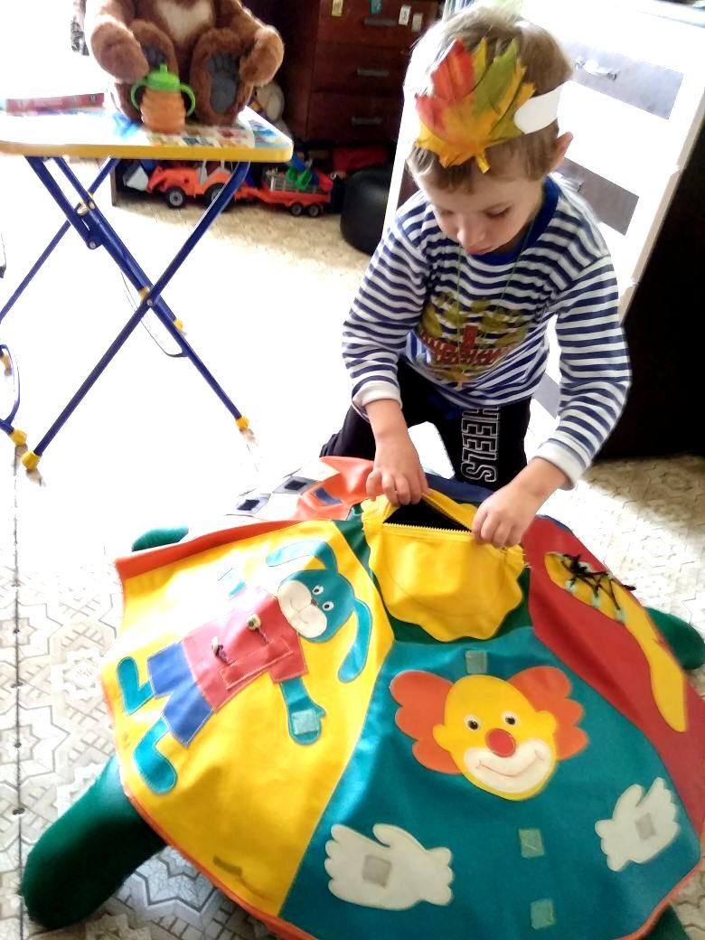 В дидактической игре с большой черепахой ребята выполняли несложные задания на развитие логического мышления и мелкой моторики.
