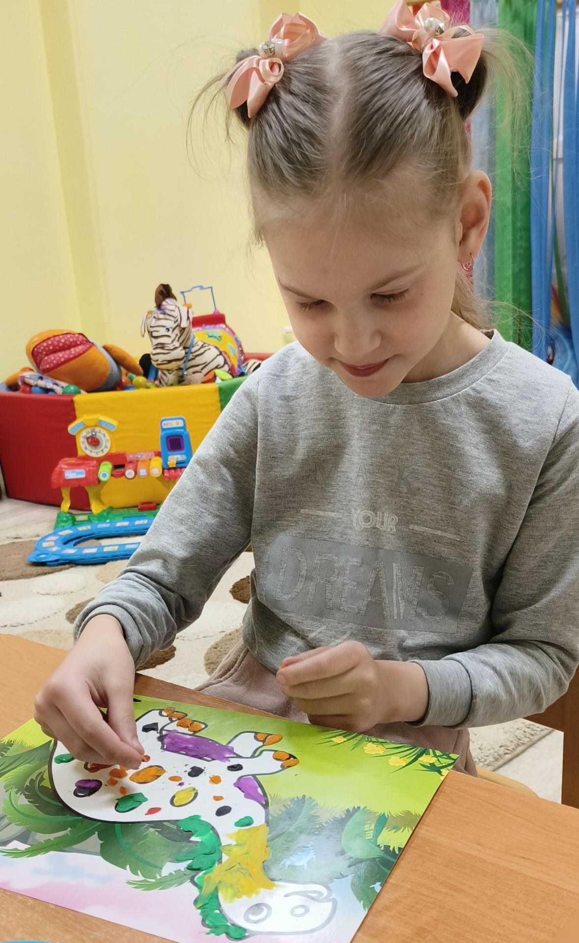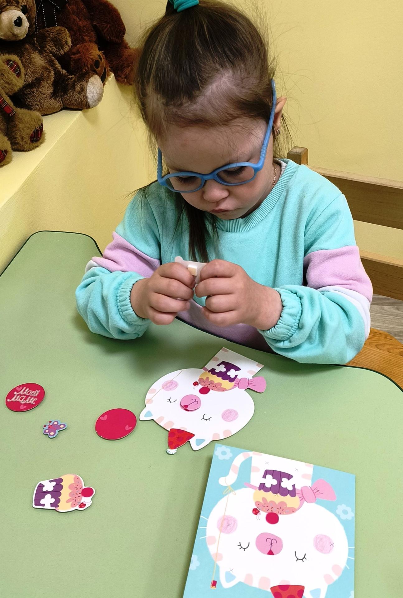 На занятиях в группе кратковременного ухода в отделении реабилитации детей с ограниченными возможностями и ранней помощи Гусь-Хрустального социально-реабилитационного центра воспитанники с большим удовольствием выполняют различные интересные творческие задания: раскрашивают цветным пластилином веселых динозавриков, с помощью трафарета и губки рисуют радужных слоников, знакомятся с техникой рисования ватными палочками, мастерят красивые открытки способом объемной аппликации.