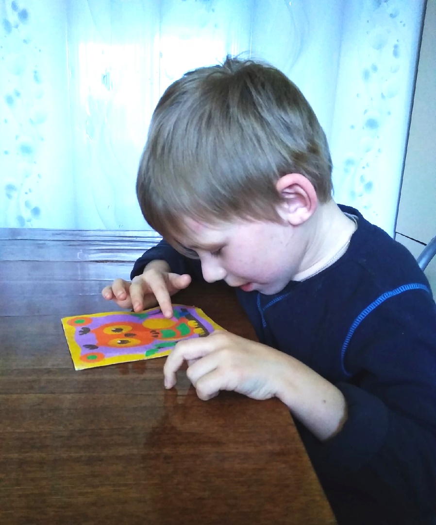 Работы, выполненные способом нанесения цветного песка на клеевую основу, требуют внимания, терпения, усидчивости и аккуратности, но результат настолько впечатляет малышей, что они подолгу и с восхищением рассматривают картинки, выполненные своими руками, а похвала за старание поднимает их самооценку и является стимулом для дальнейшего творчества, развития способностей и фантазии.